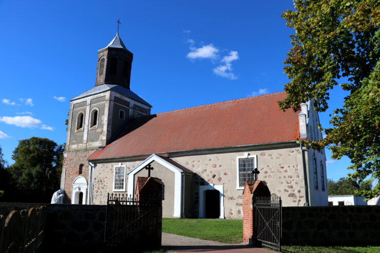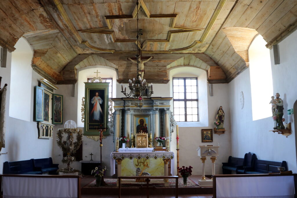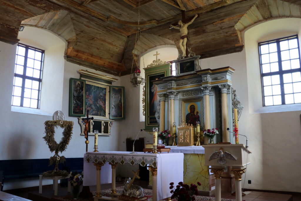 Wnętrze świątyni kryje kilka ciekawych zabytków. Przede wszystkim drewniany, bogato zdobiony ołtarz główny z 1797 roku, wykonany przez rzeźbiarza Carla Bathasara Sangalli ze Szczecina. Obraz Matki Boskiej Częstochowskiej w nim się znajdujący, jest współczesny. Ołtarz wieńczy krucyfiks, poniżej którego umieszczony został mały obraz przedstawiający Jonasza.
