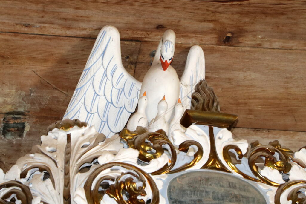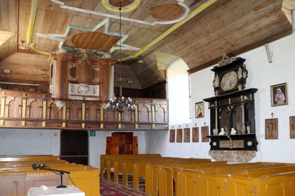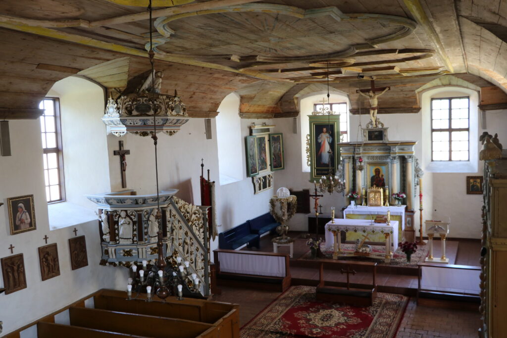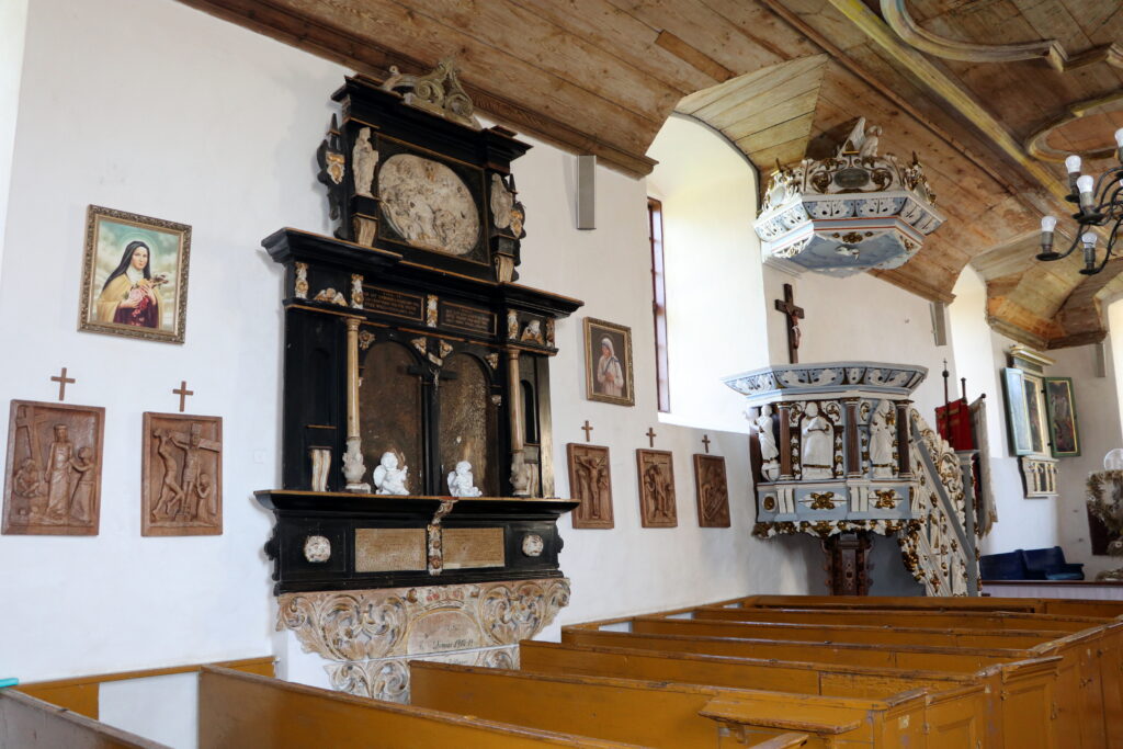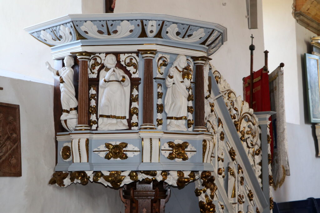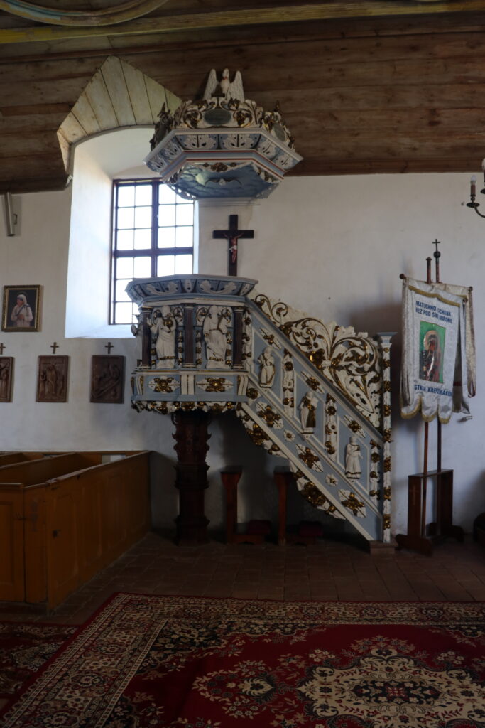 Ciekawa jest również drewniana, barokowa, bogato zdobiona ambona z pierwszej połowy XVIII wieku. Kosz zdobią wizerunki czterech osób. Na ewangelistów nie wyglądają, a przynajmniej nie posiadają ich atrybutów. Nie potrafię ich zidentyfikować, podobnie jak trzech postaci znajdujących się na balustradzie. Mogę przypuszczać, że postać z trzymająca kulę to Chrystus Zbawiciel Świata, prawą ręką błogosławiący świat, w lewej trzymający kulę ziemską. Wewnętrzną stronę baldachimu zdobi wizerunek Ducha Świętego w postaci gołębicy, zaś wieńczy go figura pelikana rozdzierającego własną pierś i karmiącego młode swoją krwią. Pelikan symbolizuje Chrystusa Odkupiciela, który oddał własne życie aby wyzwolić ludzi z niewoli grzechu karmiąc ich własnym Ciałem i Krwią w Eucharystii.