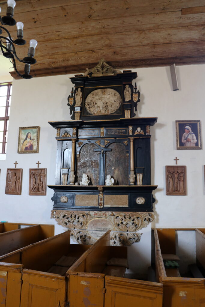 Na północnej ścianie nawy warto zwrócić uwagę na epitafium w formie ołtarza, pochodzące z 1617 roku. Upamiętnia Joachima von Wedel (1537-1614) oraz jego żonę Kordulę (zm. 1636). Owalna płaskorzeźba wieńcząca epitafium przedstawia Sąd Ostateczny. Po bokach umieszczono dwie figury, po lewej św. Piotr, po prawej św. Paweł. Poniżej znajdują się dwa cytaty, z lewej z listu do Hebrajczyków 9, 14 („To o ileż bardziej krew Chrystusa, który przez Ducha wiecznego sam siebie złożył jako nieskalaną ofiarę Bogu, oczyści nasze sumienie, abyśmy mogli służyć Bogu żywemu”), zaś po prawej z Pierwszego listu św. Jana 1, 7 („Krew Jezusa Chrystusa, Syna Bożego, oczyszcza nas z wszelkiego grzechu”). W centralnej części artysta umieścił krzyż, natomiast po obu stronach krzyża dawniej pewnie znajdowały albo jakieś płyty, albo rzeźby upamiętniające Joachima i Kordulę von Wedel.