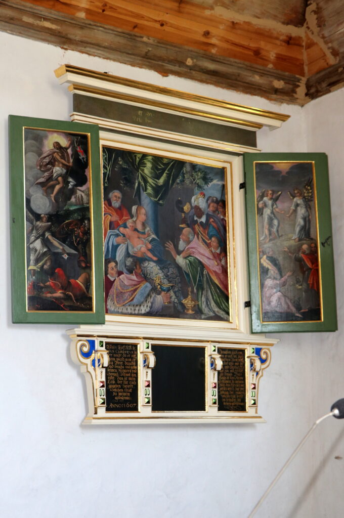 W prezbiterium warto jeszcze zwrócić uwagę na drugi ołtarz, boczny, umieszczony na ścianie północnej. Pochodzi 1607 i ma formę tryptyku. Ufundowany został przez Caspara von Wedel, wykonany przez Martina Redtela. Malowidło w centralnej części przedstawia Pokłon Trzech Króli. Na lewym skrzydle artysta przedstawił scenę Zmartwychwstania. Malowidło na prawym skrzydle to scena Wniebowstąpienia. Dla osób zastanawiających się, gdzie artysta „zgubił” Chrystusa wstępującego do nieba, wyjaśniam, że to kompozycyjny zabieg mający na celu podkreślenie tajemnicy Wniebowstąpienia. Dwa anioły unoszące się nad ziemią, to typowy motyw z Dziejów Apostolskich, gdzie aniołowie mówią uczniom: „Mężowie z Galilei, dlaczego stoicie i wpatrujecie się w niebo?”. Światłość i niebo w górnej części obrazu symbolizują Boską obecność i transcendencję. Układ tryptyku łączy tajemnice Objawienia i Paschy: narodziny i objawienie Mesjasza (Pokłon Trzech Króli), zwycięstwo nad śmiercią (Zmartwychwstanie), powrót do Ojca (Wniebowstąpienie). To klasyczna narracja chrystologiczna, często spotykana w późnogotyckich i renesansowych tryptykach np. Tryptyku Mantegni (w galerii Uffizi we Florencji). Pod ołtarzem cytat z Pisma Świętego w języku niemieckim, pisany gotykiem (fragment przytaczający słowa Jezusa podczas Ostatniej Wieczerzy – przemiana chleba w Ciało i wina w Krew Chrystusa) oraz data 1607 r.